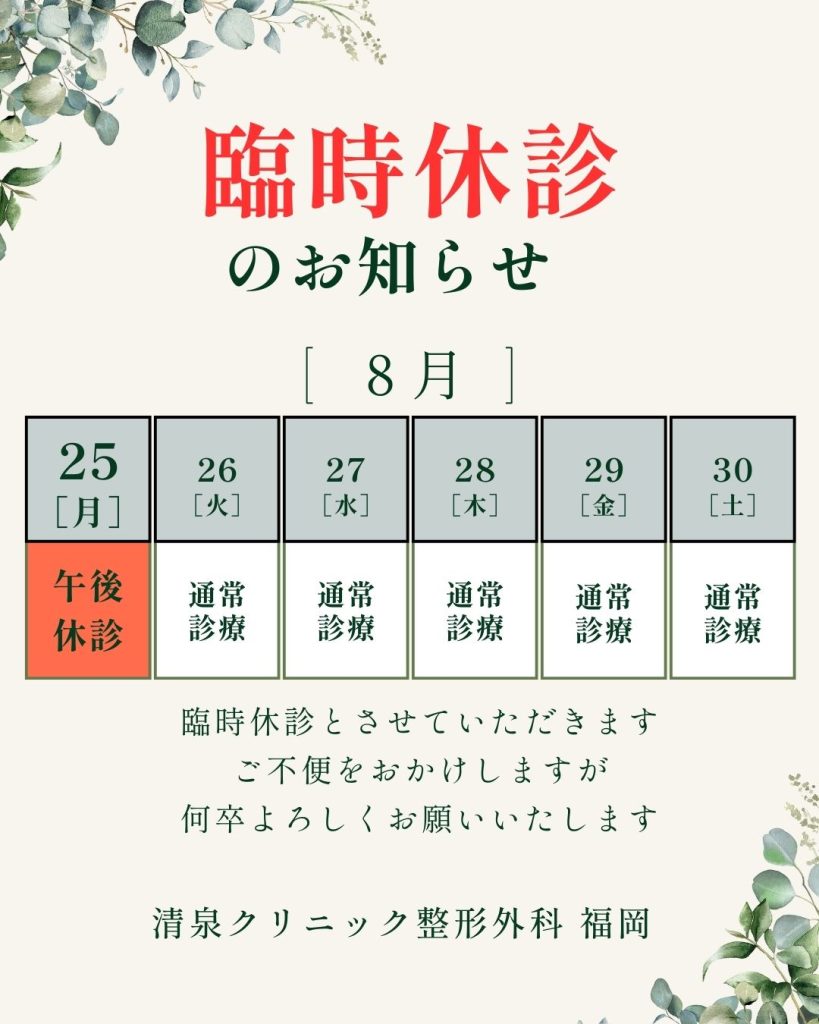 8月25日(月)午後の診療を休診とさせていただきます。