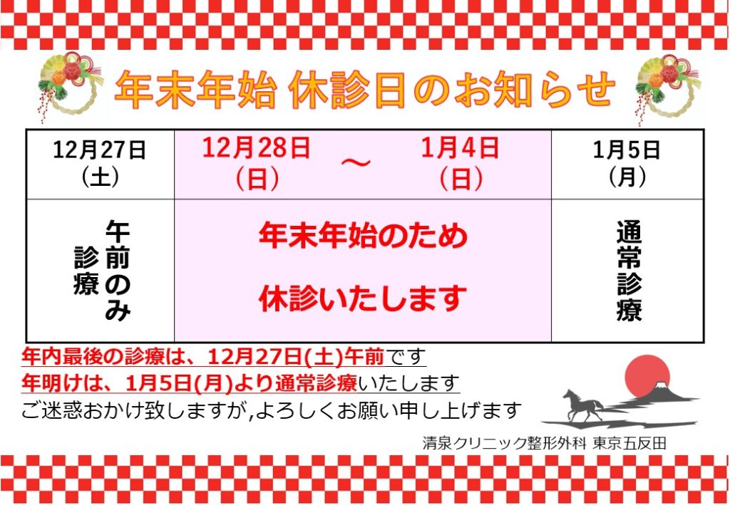 2025-12-14 年末年始休診のお知らせ 誠に勝手ながら、下記の期間を年末年始の休診とさせていただきます。 休診期間:12月28日(日)~1月4日(日) 年明けは 1月5日(月)より通常診療 を開始いたします。 ご不便をおかけいたしますが、何卒ご理解のほどお願い申し上げます。